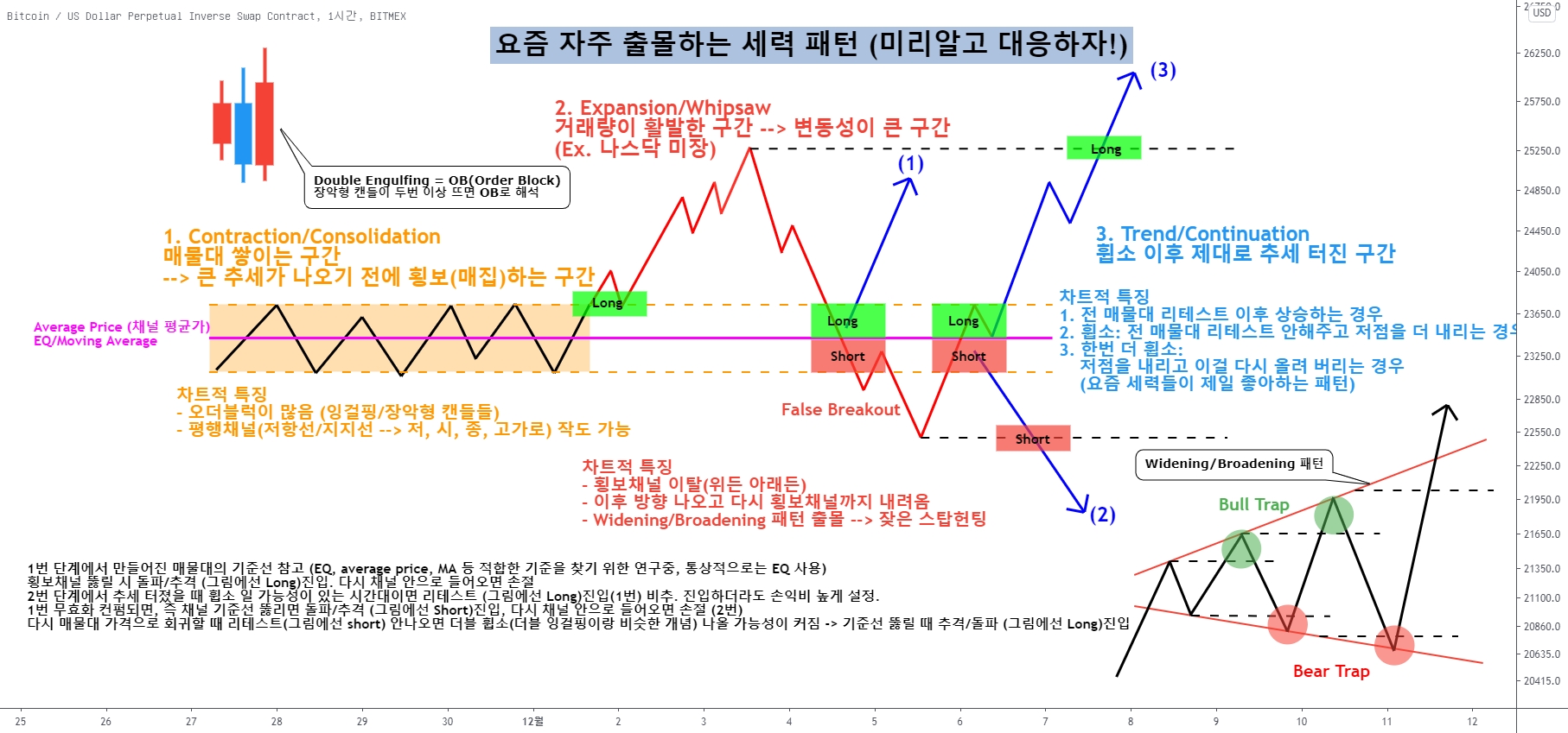 안녕하세요 트레이더 여러분~ 토미입니다 =) 오늘은 많은 구독자, 회원, 그리고 수강생 분들이 최근 빗발치게 문의를 주셨던 매물대 혹은 오더블럭(Orderblock)에 대한 강의 자료를 준비해봤습니다. 사실 제 전 강의 자료들 중간중간 관련 설명들이 짤막짤막하게 있었지만 이 주제로만 집중적으로 다루는 건 처음인 것 같네요. 제 이전 강의들을 참고하신 분들이라면 아실 만한 내용이지만 새로운 분들을 위해 조금 더 자세하고 체계적이게 정리한 자료를 만들었습니다. - 매물대란? 먼저 ‘매물대’라는 개념에 대해서 설명을 드리도록 하겠습니다. 매물대라는 용어 자체가 어찌 보면 너무 포괄적이고 보편적이면서도 상대적이고 주관적인 개념입니다. 상황과 위치에 따라 해석하기 나름입니다. 제 트레이딩 경험과 철학을 바탕으로, 그리고 기술적 분석 및 차트 이론 관점으로 매물대라는 용어를 정의해보자면, 과거에 상대적으로 다른 가격 구간보다 거래가 활발하게 이루어진 가격 구간이라고 말씀드릴 수 있겠습니다. 이게 한 문장으로 꼭 집어서 설명하기 참으로 애매모호한 개념입니다. 상황, 상품, 그리고 시장 참여 당사자의 위치 등에 따라서 매물대라는 개념을 다양하게 접근할 수 있습니다. 누군가는 세력들이 물량을 매집해놓은 구간(세력들 평단), 누군가는 수많은 개미들의 진입가, 익절가, 손절가, 그리고 평단가들이 모여 있는 구간, 그리고 누군가는 세력들의 장난질에 의해 쌓인 개미들의 무덤이라고 매물대를 정의할 것입니다. 뭐가 되었든 우리는 솔직히 그리 큰 신경 쓸 필요는 없습니다. 왜냐고요? 우리는 단지 이 매물대라는 녀석의 성향과 효율적으로 찾아내는 법을 터득하고 활용해 이걸로 돈만 벌면 되기 때문이죠. - 관련 보조지표 일단 이 매물대라는 놈을 도출할 때 유용하게 사용할 수 있는 보조지표 몇 가지를 알려드리겠습니다. 가장 먼저 차트 보는 사람이라면 시대와 상품을 불문하고 누구나 통상적으로 참고하는, 거래량(Net Volume ) 지표가 존재합니다. 거래량 지표 활용법은 구글, 네이버 블로그, 유트브 등 인터넷에서 흔히 찾아볼 수 있으니 길게 설명 안 하겠습니다. 사실 설명할 것도 없는 게 거래량 = 거래된 양입니다. 너무 당연한 소리지요? 약간의 부가 설명을 얹어드리자면, 거래량이란 시간(혹은 캔들 단위)을 기준으로 시장 참여자들이 매물을 사고 팔고 한 횟수/수량을 뜻합니다. “주가는 거래량의 그림자다” 혹은 “거래량은 추세의 연료이다”라는 말도 있듯이 거래량은 기술적분석에 있어 가장 기본이 되는 정석 지표로 알려져 있습니다. 주가 움직임의 거래량 동반 여부(주가 상승/하락 시 거래량 증가/감소 현상)로 진행중인 추세가 현재 무릎인지 어깨인지 가늠하는 방법, 세력들의 매집 현황(물량 및 평단가)을 포착하는 방법, 그 외에 거래량 이평선, 거래량 사이클 이론 등 다양한 거래량 지표 활용 기법들이 존재합니다. 하지만 여러분, 매번 강조 드리지만 이 금융 세계는 시대에 따라서 변하기 마련입니다. 다수의 지표들처럼 거래량도 후행성이 강하고, 특히 요즘엔 마켓 메이커들, 즉 세력들이 자전거래 등을 통해 거래량에만 맹신하는 개미들을 속이는 일이 비일비재 해졌습니다. 저도 한때 거래량에 목숨을 걸었던 사람으로서 제 견해를 말씀드리자면, 지금은 거래량 지표가 예전보다 실용성이 대폭 떨어졌다고 봅니다. 시장을 장기적인 관점으로 볼 때, 그리고 선물보다는 현물 종목(특히 주식)을 분석할 때 그나마 어느 정도의 활용가치가 있긴 하지만 이거 하나만 가지고 타점을 잡거나 함부로 추세를 예측하는 행위는 예전만큼 잘 먹히지가 않습니다. 게다가 요즘 같이 스캠무빙과 세력들의 장난질이 허구한 날 나오는 시대엔 시장/상품의 매력도(Market Attractiveness)와 유동성(Liquidity) 정도만 거시적인 관점으로 참고하는 걸 추천 드립니다. 다음으로 소개시켜드릴 지표는 볼륨 프로파일(VPVR or VPFR: Visible/Fixed Range Volume Profile )입니다. 사실 제가 방금 거래량 지표를 깐 이유가 이놈 때문입니다. 시간을 축으로 거래된 양을 보여주는 일반 거래량 지표와 다르게 볼륨 프로파일은 가격을 축으로 거래된 양을 시각화해주는 지표입니다. 아래 비트코인 차트 우측에 있는 히스토그램이 바로 이 지표입니다. 간략히 설명 드리자면 히스토그램 바가 길게 나온 구간(High Volume Area)일수록 더 많은 양의 거래가 이루어진 가격대로 해석하시면 됩니다. 개인적으로 제가 최근 실전에서 용이하게 사용하고 있는 지표이며 수평 매물대를 파악 및 컨펌하는 용도로 안성맞춤입니다. (볼륨 프로파일 지표의 상세한 사용법은 제가 나중에 따로 커버해드리겠습니다.)