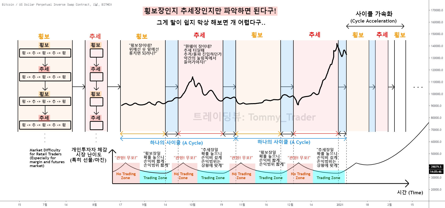 현존하는 대부분의 금융 상품들은 횡보장과 추세장을 무한히 반복하는 성질을 가지고 있습니다(아래 그림/링크 클릭). 간혹 추세장이 출현하기 직전 비교적 좁은 폭으로 주가가 박스권 혹은 수평 채널 내에서 횡보 움직임을 형성해줄 때가 있습니다. 이 구간을 오더블럭 매물대로 볼 수 있다는 겁니다! 좁은 가격 범위 내에 오랫동안 주가가 횡보를 한다면 당연히 수평 매물대가 쌓이겠죠?