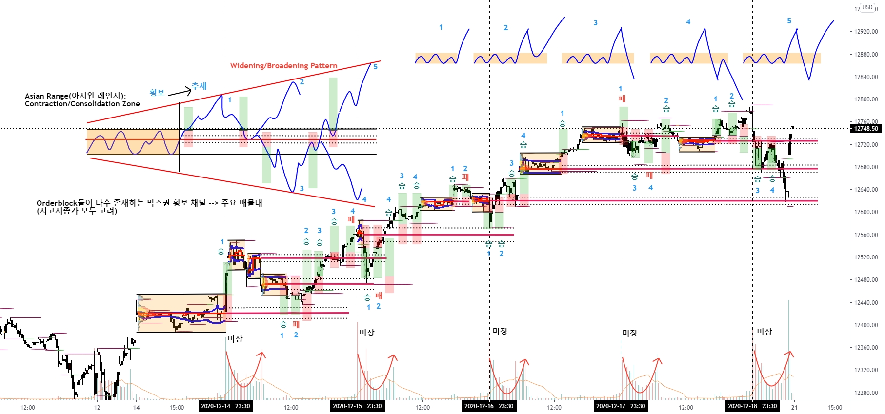 박스권 수평 매물대... 1. 채널의 가격 범위가 최대한 좁을수록 (오더블럭 세로 길이가 짧을수록) 2. 채널이 오랜 기간동안 형성될수록, 즉 채널 내에 캔들 개수가 많을수록, (오더블럭 가로 길이가 길수록) 3. 채널 내에 장악형 캔들이 더 많이 존재할수록 (오더블럭 내에서 주가가 위아래로 더 많이 흔들수록) 더 큰 신빙성과 가중치를 부여할 수 있습니다. 참고로 FX(Forex/외한, 통화) 트레이더들은 유럽과 미국 장이 닫혀 있을 때(주로 도쿄 장 시작 때부터) 거래량이 적은 현상과 그때 형성되는 수평 횡보 채널들을 Asian Range라고 칭하기도 합니다. 해당 기법을 활용한 예시들은 다음과 같습니다.
